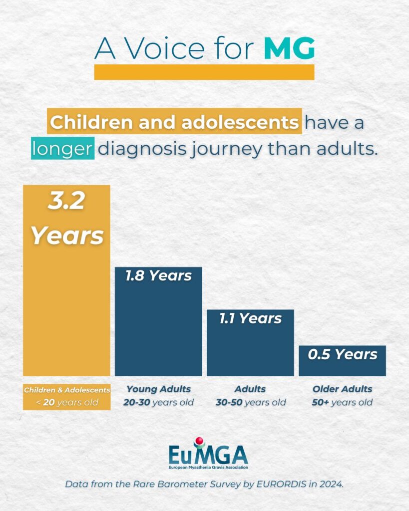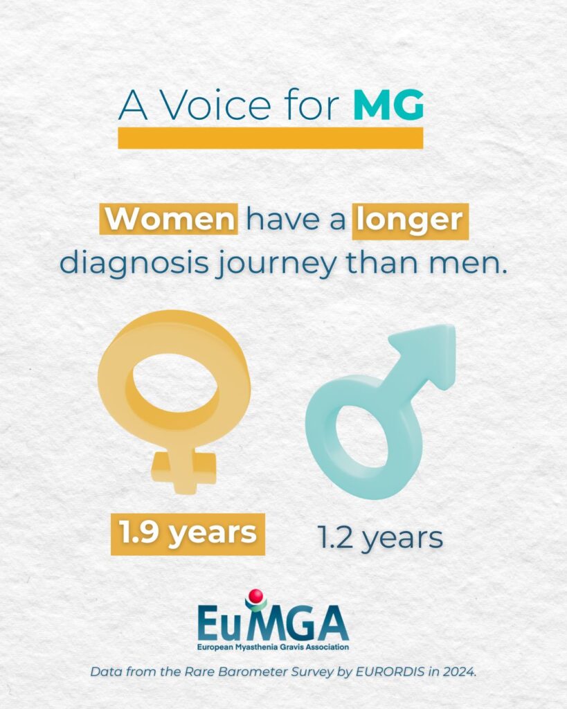 In a 2024 Rare Barometer Survey by EURORDIS-Rare Diseases Europe, out of 139 respondents living with Myasthenia Gravis, women had a diagnostic journey of 1.9 years while men had a diagnostic journey of 1.2 years.
