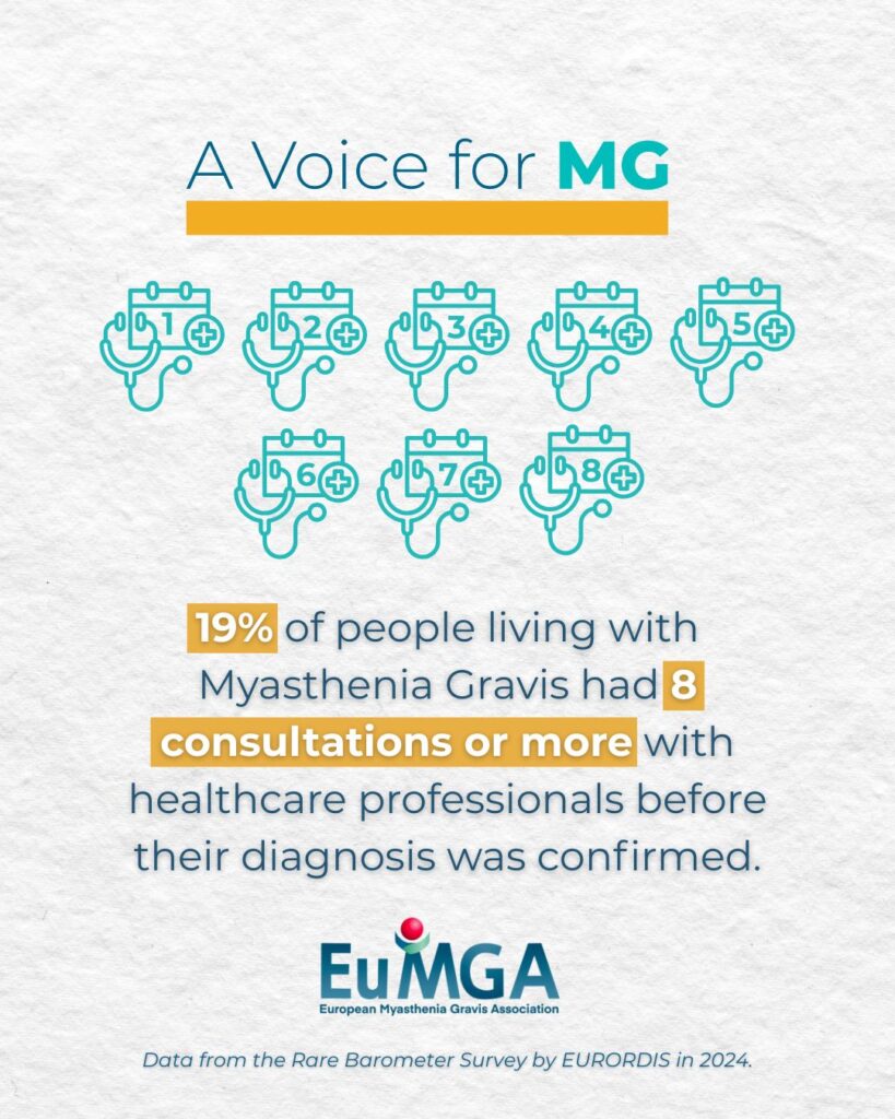 In a 2024 Rare Barometer Survey by EURORDIS-Rare Diseases Europe, out of 139 respondents living with Myasthenia Gravis, 19% had 8 consultations or more with healthcare professionals before their diagnosis was confirmed.